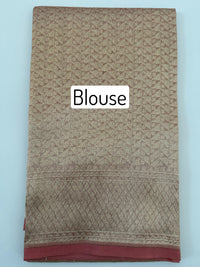 Lightweight, sheer Kora silk saree from Banaras. Body of the saree has beautiful floral motifs in white threads and gold zari. Pallu has beautiful gold zari in geometric pattern, Blouse has rich brocade pattern in gold zari.