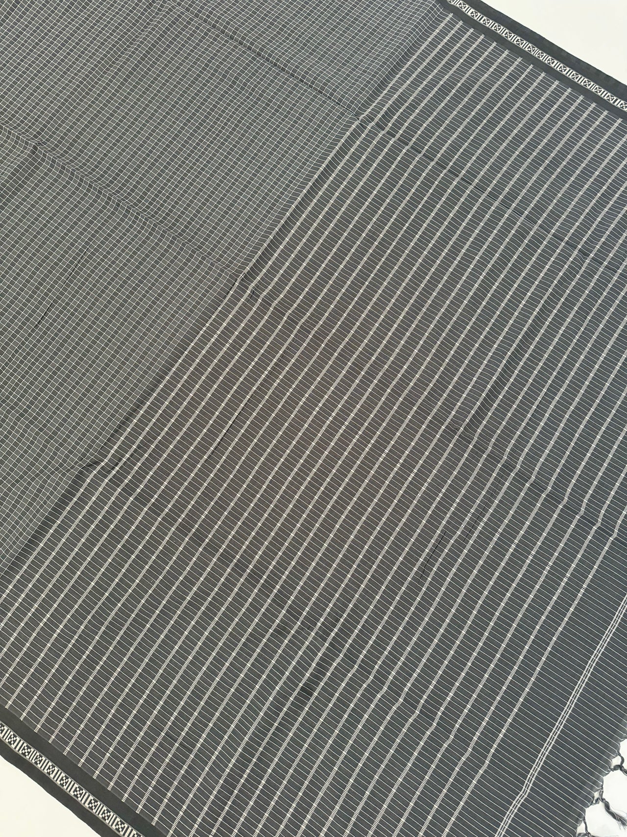 Beautiful gray and black pure cotton saree. Simple and elegant, very soft. NO BLOUSE.