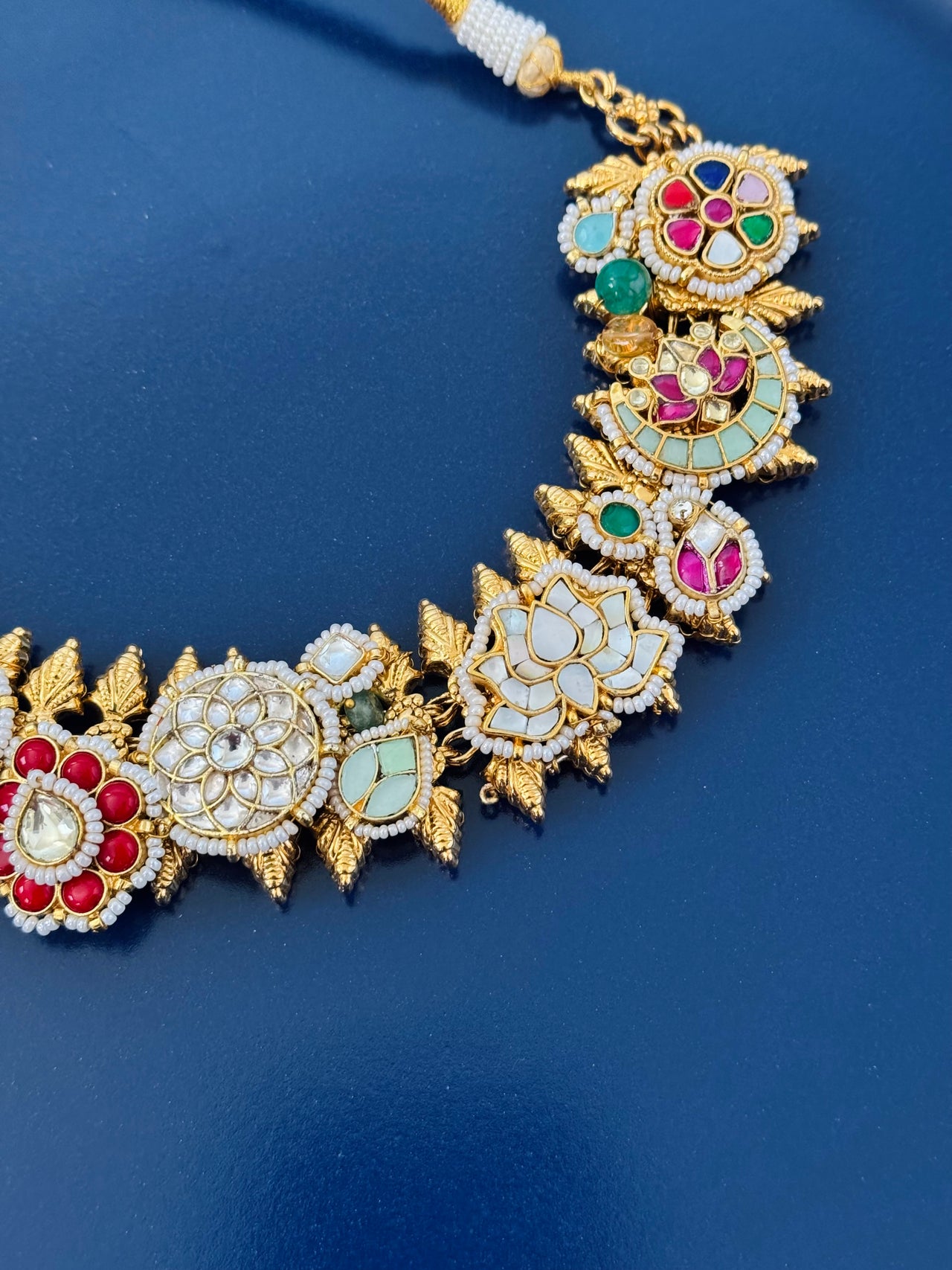 Ahmedabadi Kundan Fusion Necklace Set | Semi-Precious Stones | Brass Base | Gold Plated | Silver Foil | Free Shipping | Ships from California