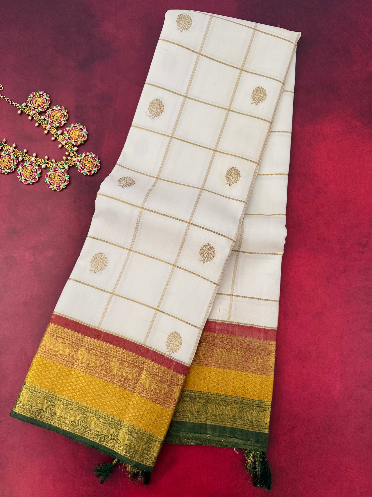 Contrasting Borders: Korvai technique is known for its contrasting and vibrant borders. The body of the sari and the borders are often in different colors and patterns, which are meticulously woven together.