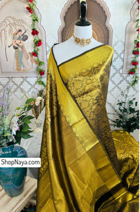 ShopNaya Exclusive | Brocade Kanchipuram Pure Silk Saree | Metallic Black | Pure Gold Zari | Handwoven | Ships from California